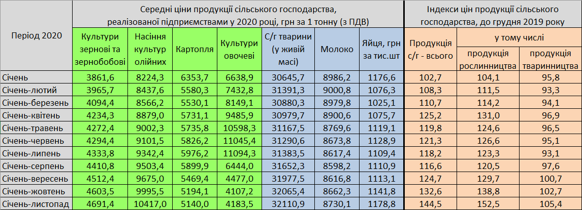 Особливо це стосується продукції рослинництва, індекс якої порівняно з груднем 2019 року складає 152,5 відсотків. Станом на 18 грудня поточні ціни на 4 клас пшениці склали 7300 грн/т, кукурудзи – 6800, 3 клас ячменю – 6900. Олійні культури взагалі побили рекорд максимуму – 16000-18000 грн/т. Така ситуація хоч і частково, але дозволить знівелювати гіркий присмак 2020 року.