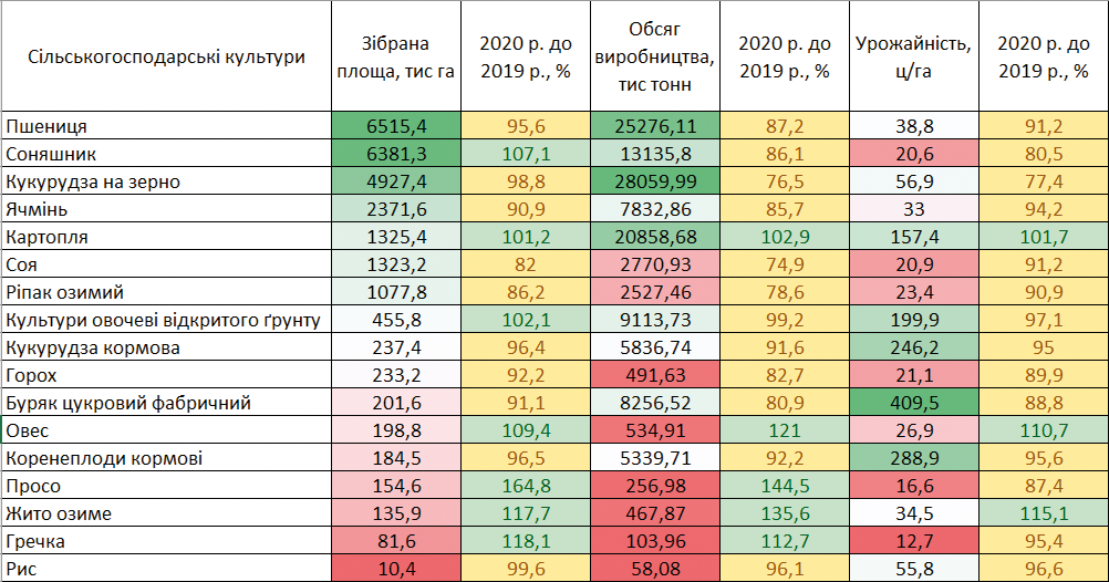 Завдяки показникам урожайності валовий збір також істотно зменшився: по зернових і зернобобових культурах – на 17,6%; технічних – від 14 до 21%, інших – майже на 10%.