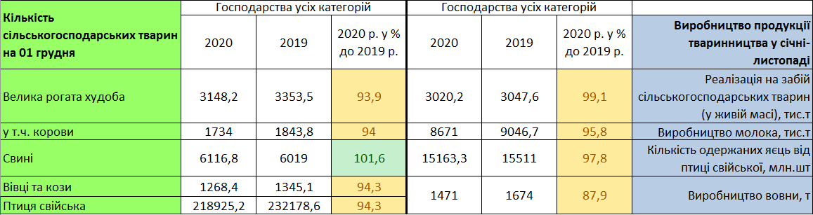 Проблеми з кількістю сільськогосподарських тварин напряму впливають на виробничі показники галузей. Так, за усіма видами виробництва спостерігається спад. Найнижчий зафіксований при реалізації живої маси усіх видів тварин – 0,9 відсотка, а найвищий – у вівчарстві (12,1%). Молока виробляють українські аграрії 8,7 млн тонн при зменшенні у 4,2 відсотки, а яєць 15,1 млрд штук при падінні на 2,2 відсотки.