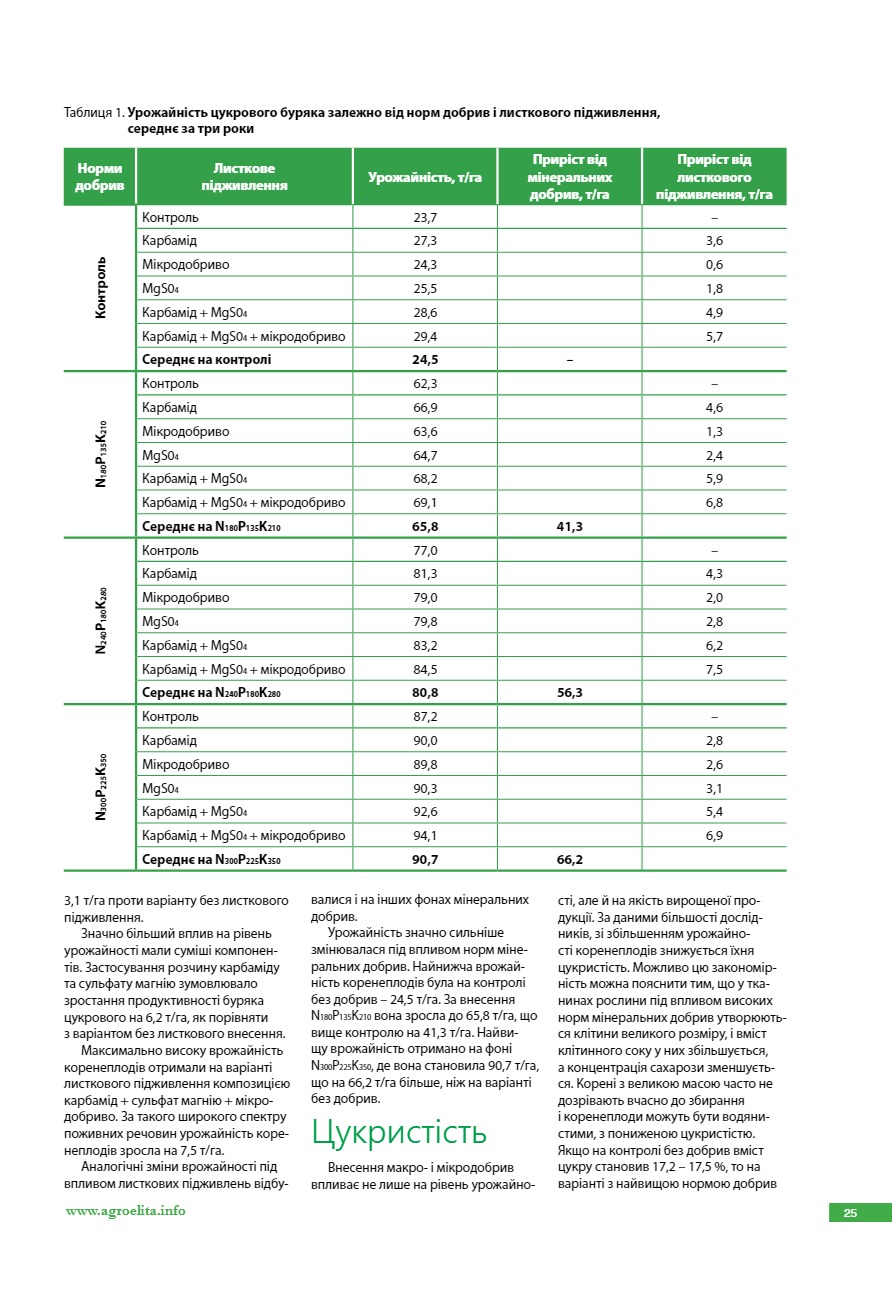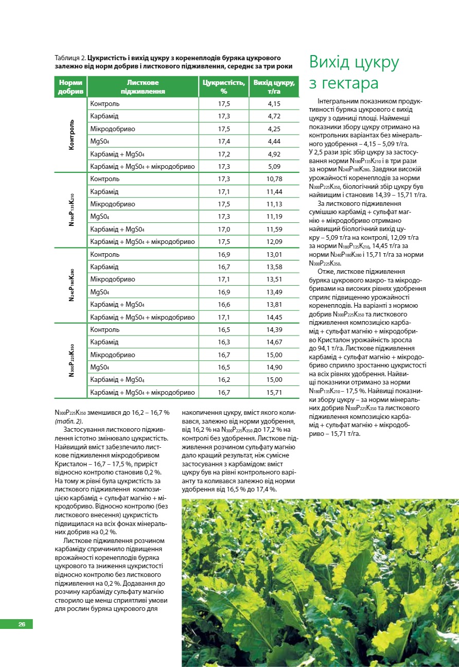 Урожайність і цукристість коренеплодів цукрового буряка залежно від листкового підживлення