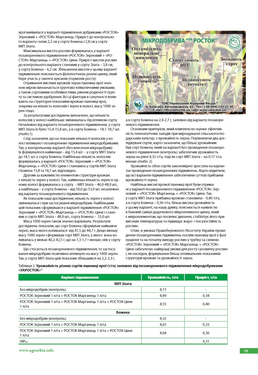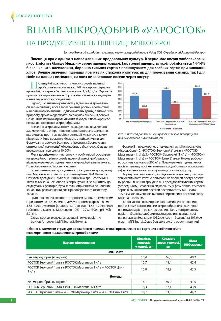 Вплив мікродобрив «УАРОСТОК» на продуктивність пшениці м’якої ярої