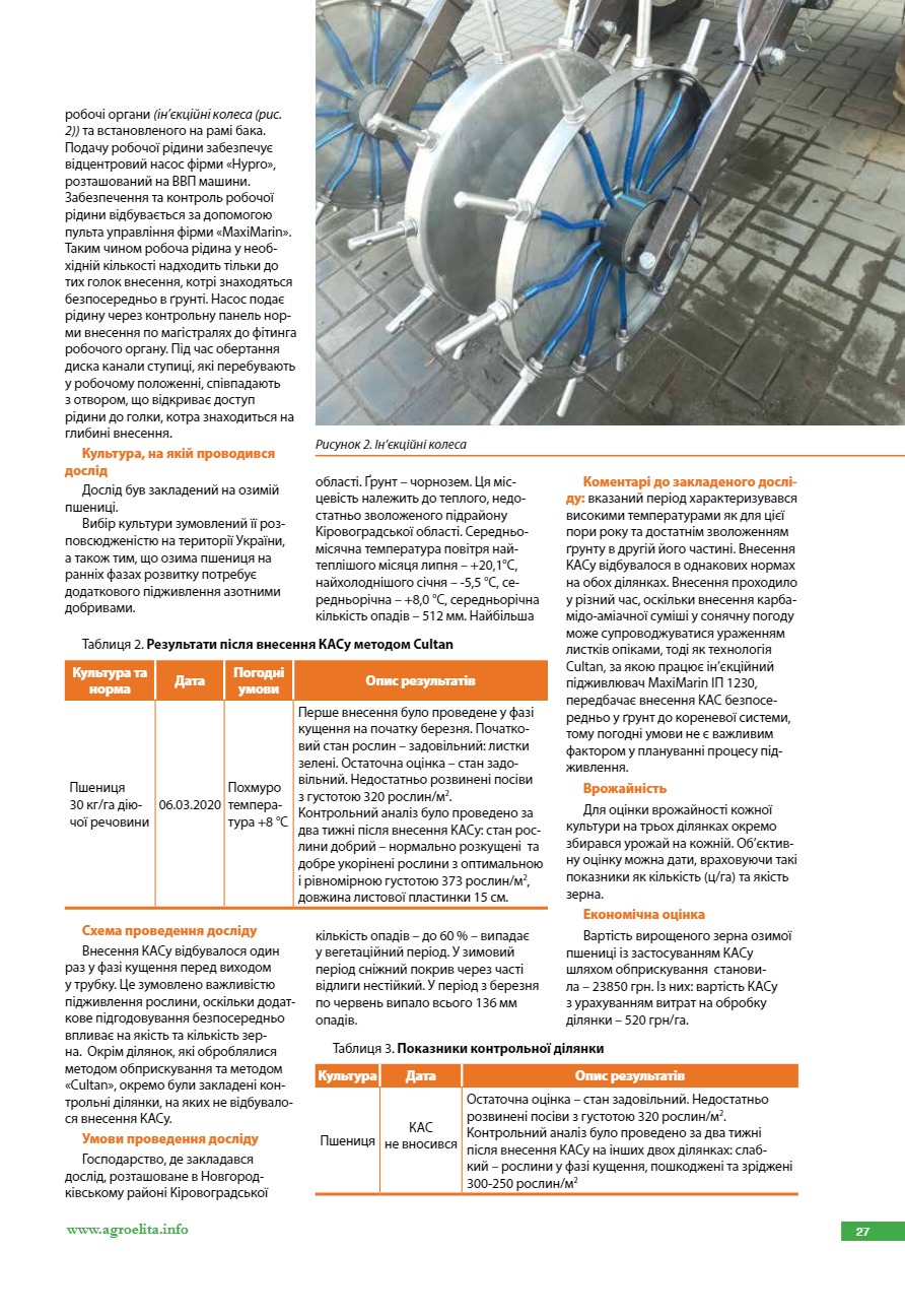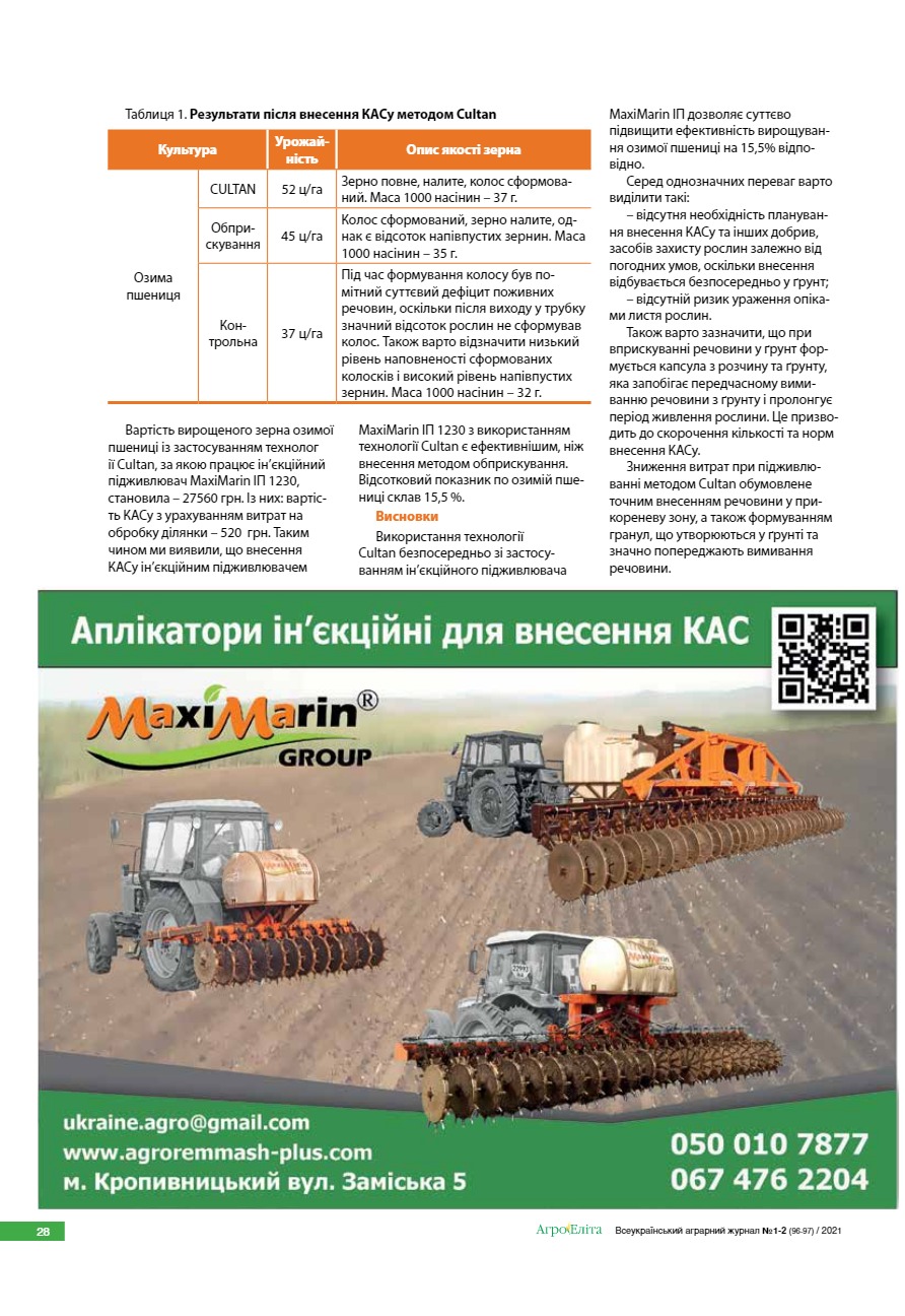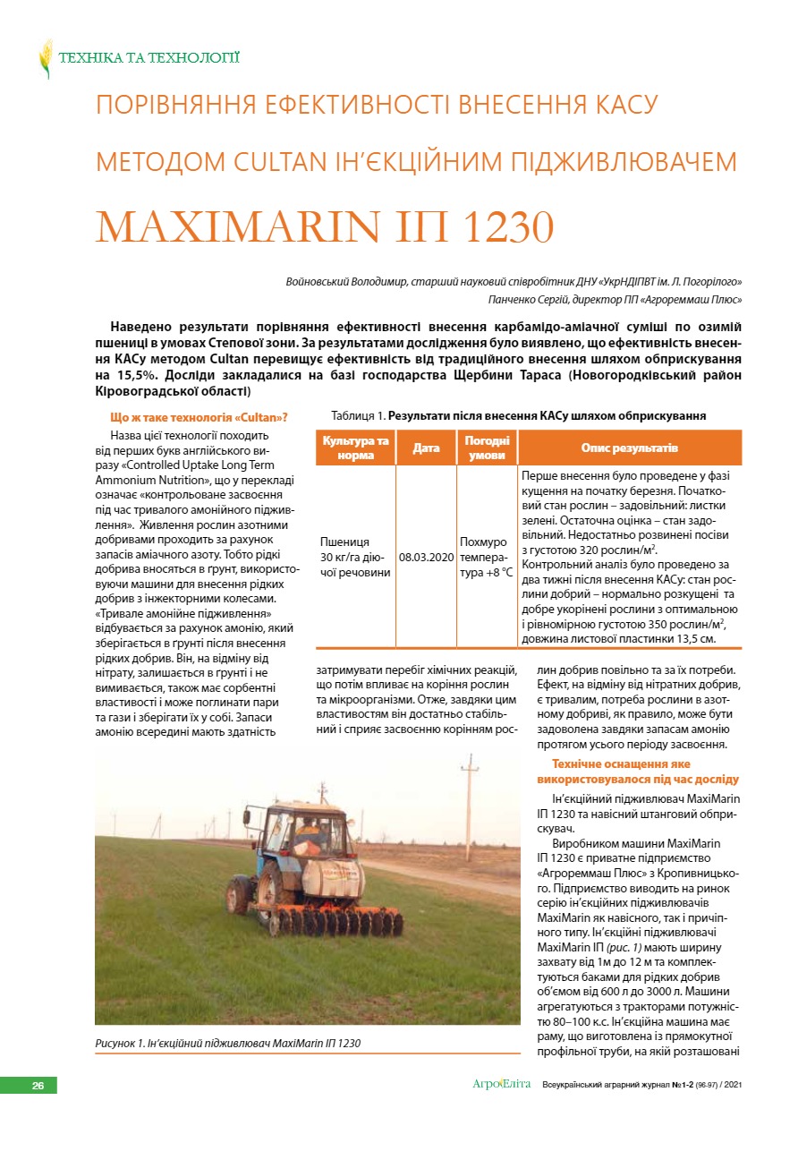 Порівняння ефективності внесення КАСу методом Cultan ін’єкційним підживлювачем MaxiMarin ІП 1230