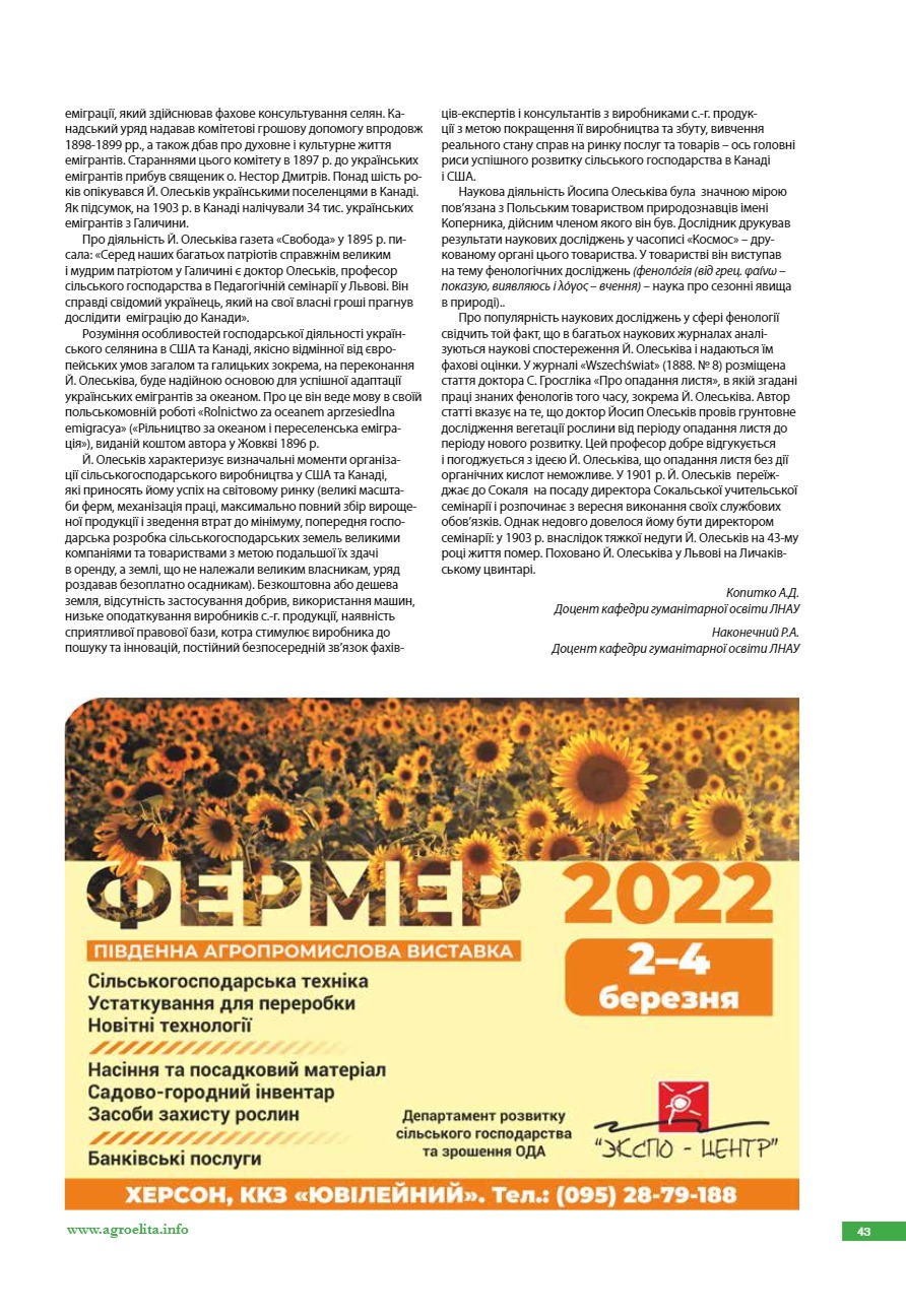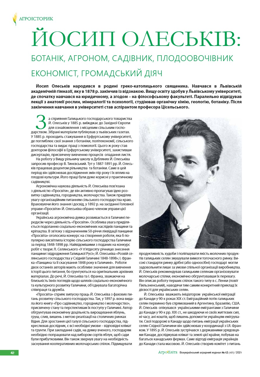 Йосип Олеськів: ботанік, агроном, садівник, плодоовочівник економіст, громадський діяч