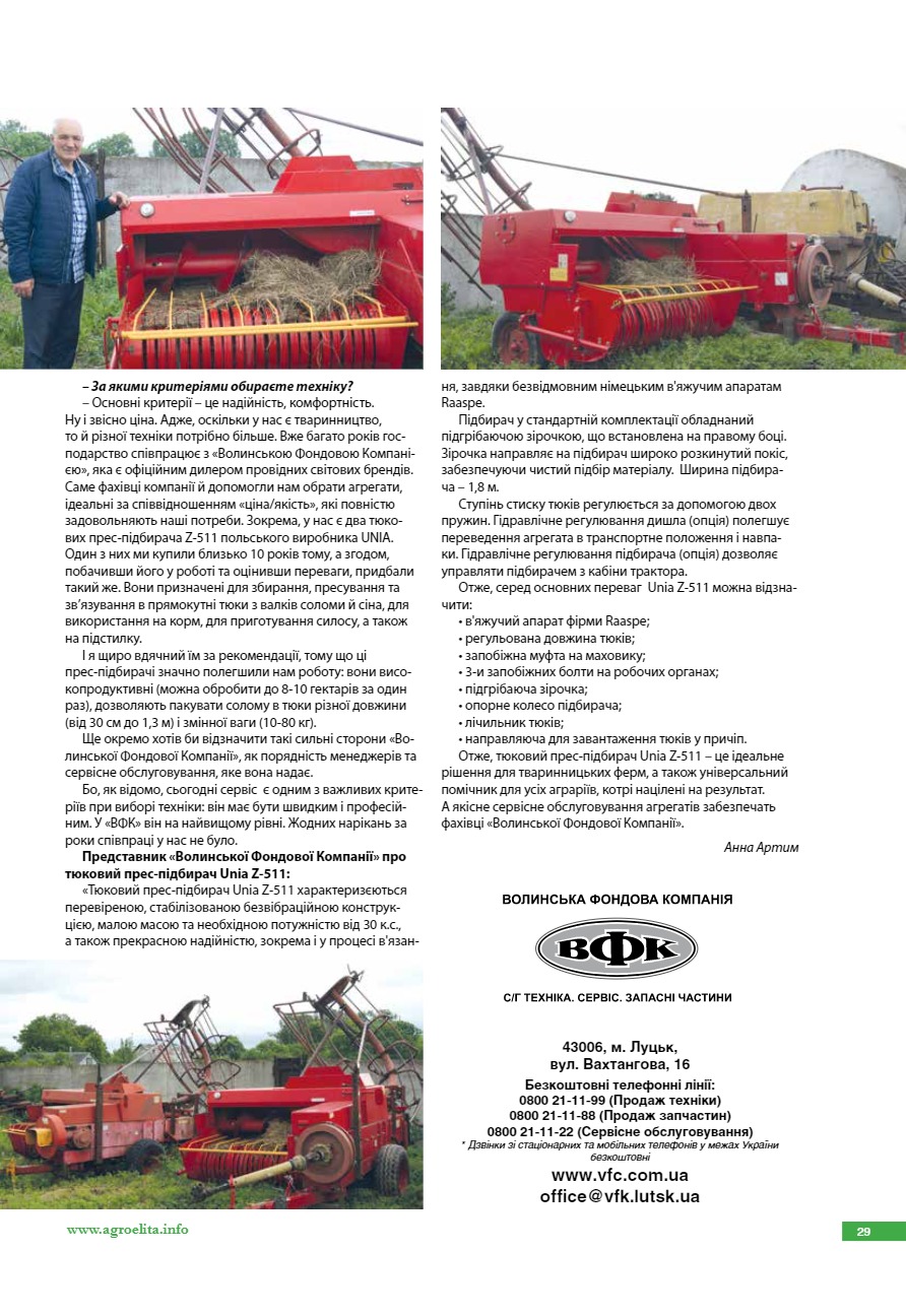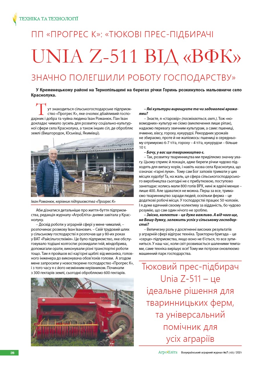 ПП «Прогрес К»: «Тюкові прес-підбирачі Unia Z-511 від «ВФК» значно полегшили роботу господарству»
