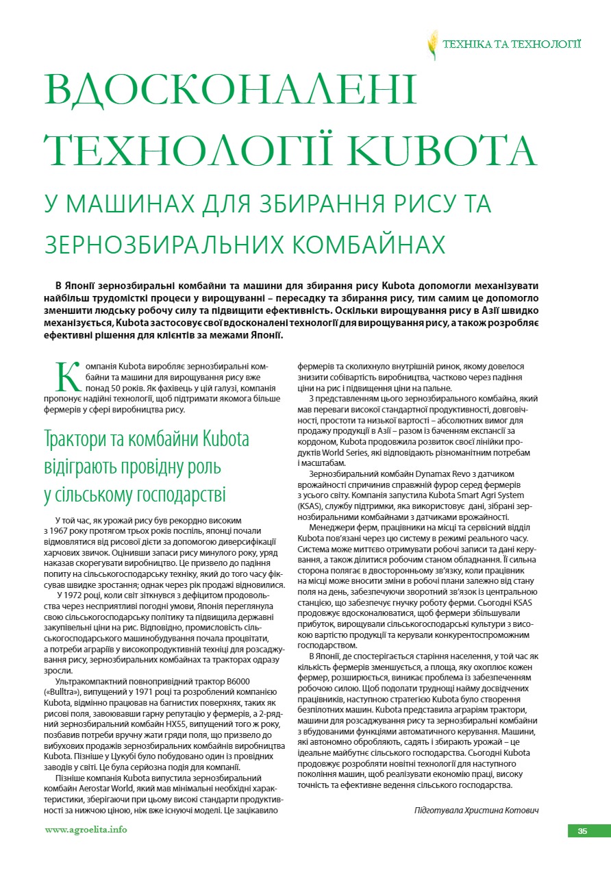 Вдосконалені технології Kubota у машинах для збирання рису та зернозбиральних комбайнах