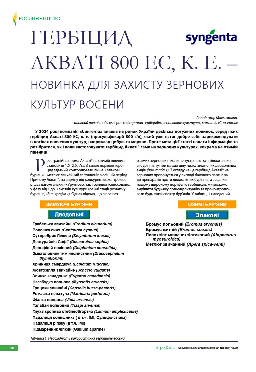 Гербіцид Акваті 800 ЕС, К. Е. – новинка для захисту зернових культур восени