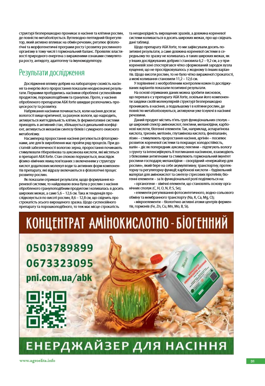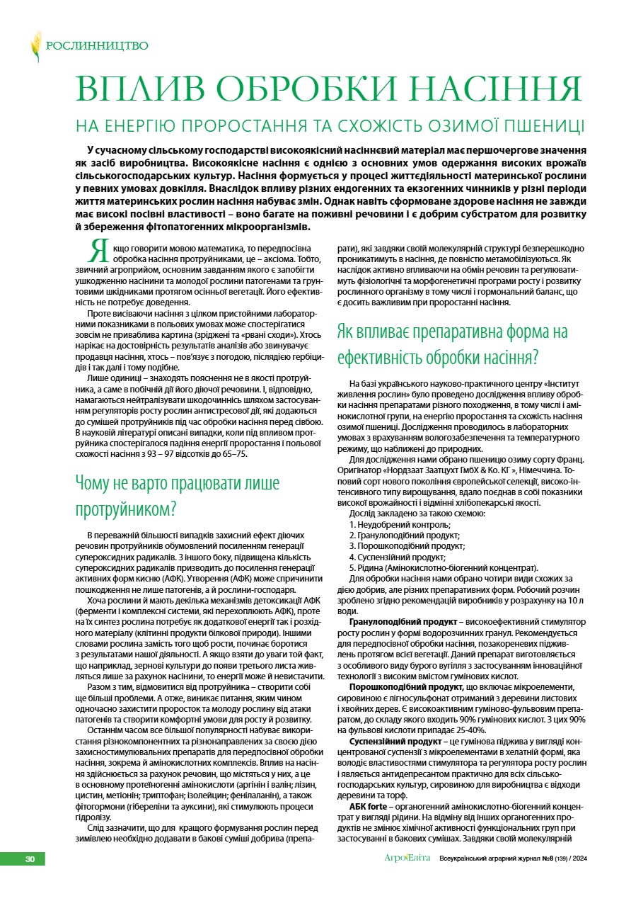 Вплив обробки насіння на енергію проростання та схожість озимої пшениці