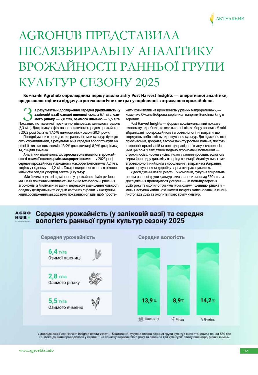 Agrohub представила післязбиральну аналітику врожайності