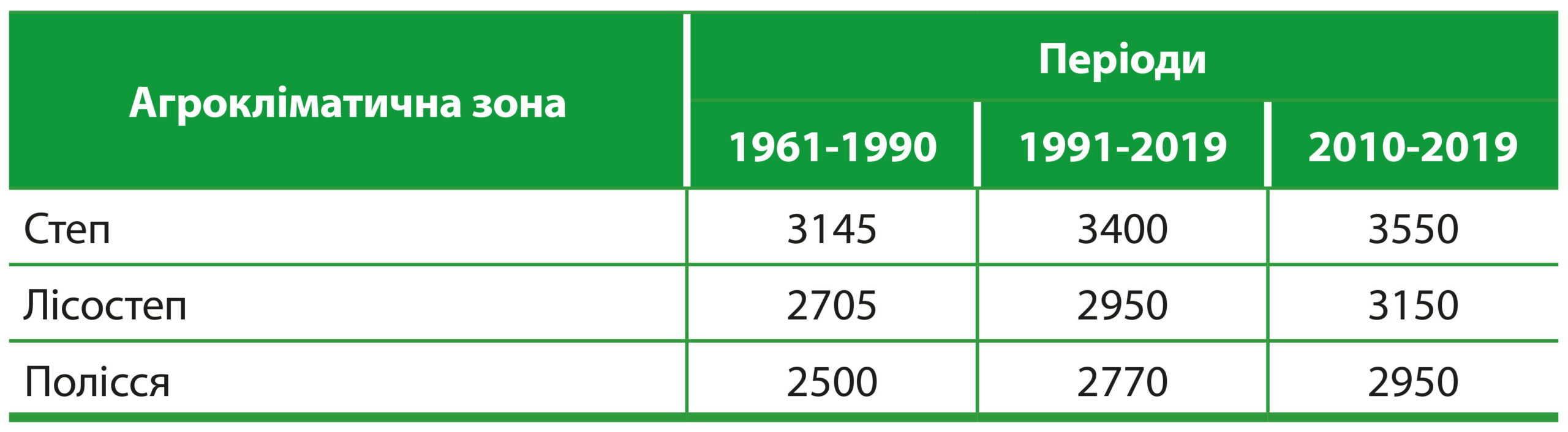 Як наслідок, суми активних (позитивних) температур повітря вище +10°С накопичуються на рівні +100-200°С за останні 10 років, а це означає: у Степу на сьогодні середній показник становить 3550, у Лісостепу – 3150, на Поліссі – 2950 (табл. 1).