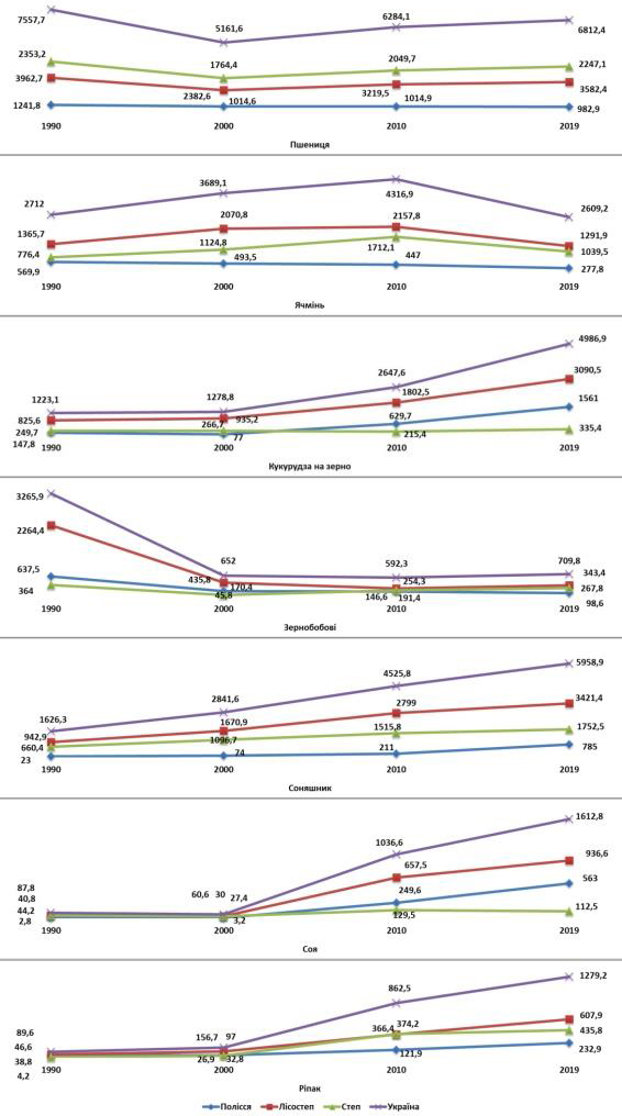 У регіонах, які належать географічно до Лісостепу, зміни у виробничій програмі, звичайно, менш кардинальні, але теж мають характерні властивості за загальної кліматичної ситуації. Так, у більшості областей поступово зменшується частка зернових злакових культур: пшениці – 9,6%, ячменю – 5,4%. У цій групі простежується тенденція до істотного зниження площ під згаданими культурами у регіонах, які територіально наближені до степової зони. Хоча в північних та західних областях площі навпаки збільшуються. Посіви кукурудзи на зерно постійно зростають і за останні 30 років зросли у 3,7 рази (Львівщина – 7,9 рази, Полтавщина – 6,3 рази). Зернобобові культури зменшилися на 84,2%. Технічна група теж стала «улюбленицею» для фермерів. Частка соняшнику збільшилася у 3,6 рази, при цьому у північних областях зони підвищення сягнуло 350,5 разів – Хмельниччина; 59,9 разів – Тернопільщина, 25 разів – Львівщина, Франківщина, Чернівеччина. Посівні площі під соєю зросли у 22,9 рази (Хмельниччина – 896,5 рази, Львівська – 578,0, Тернопільщина – 450,5 рази). Щодо ріпаку, то площі під цією культурою зросли у 12,5 разів (Кіровоградська – 607,0 рази, Дніпропетровська – 191,3 рази).