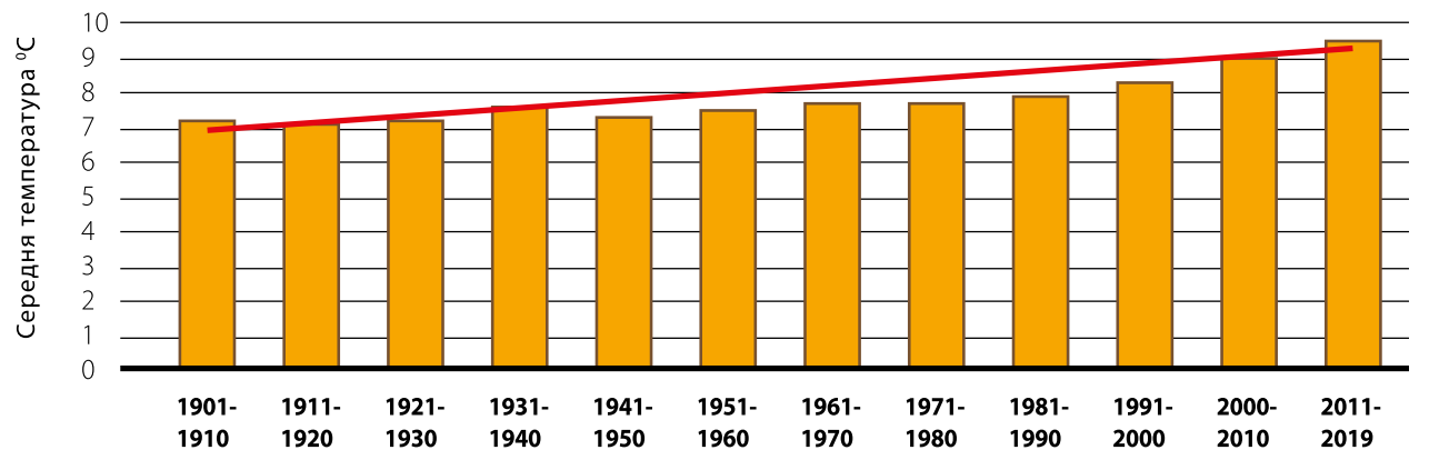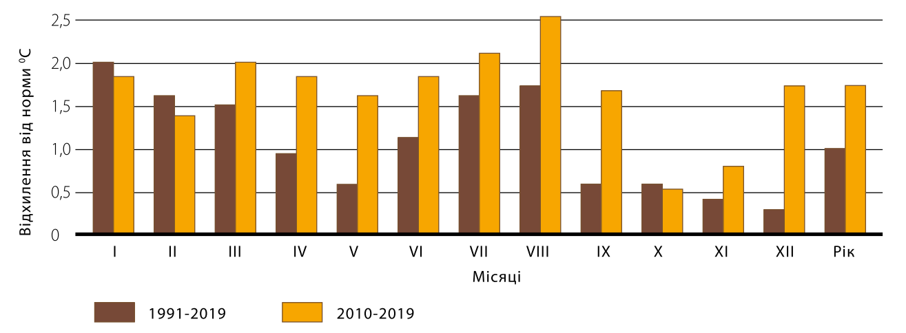 Як свідчать дані багаторічного моніторингу, середня річна температура в Україні підвищилася на 1,2°С за тридцять останніх років та на 1,7°С за останні 10 років (рис. 1). Підвищення температури у холодний період (листопад-березень) складає в середньому 1,3°С, у теплий (квітень-жовтень) – 1,1°С. При цьому виявлені відхилення температури повітря від норми у період 1989-2019 рр. були найбільшими за всю історію спостережень за погодою.