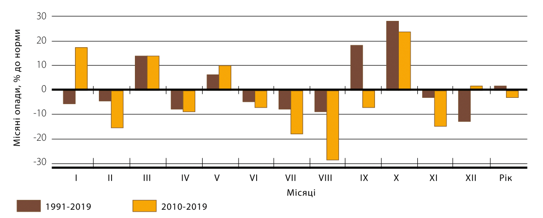 Рис. 3. Зміна кількості опадів по місяцях за період 1991-2019 років та за період 2010-2019 років відносно норми