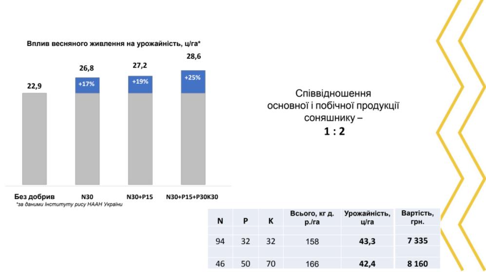 Для того, щоб зрозуміти, як соняшник відгукується на азот, спікер привів результати дослідження інституту рису щодо впливу весняного живлення на урожайність.