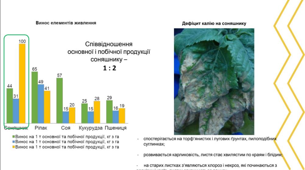 Далі бізнесмен розповів про особливості живлення соняшнику. Так, він повідомив, що для того, щоб сформувати 1 тону основної та побічної продукції соняшнику потрібно 44 кг азоту. При цьому співвідношення має бути 1:2. Тобто, щоб отримати 1 т основної продукції потрібно сформувати агроценоз, у якому загальна маса буде складати 3 т. При цьому калію взагалі будуть потрібні захмарні кількості.