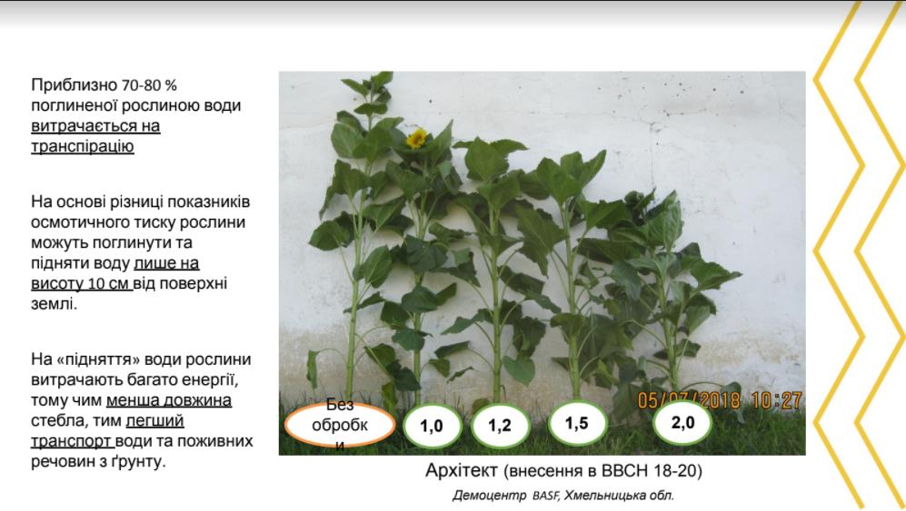 «Самий важливий компонент – це оптимізація транспортних витрат. Приблизно 70-80% поглиненої рослиною води витрачається на транспірацію – охолодження рослинного організму, доставку поживних речовин саме в місця їх потреби. І цей процес достатньо енергозатратиний. Завдяки осмосу рослина може підняти воду лише на висоту 10 см від поверхні землі. На іншу висоту працюються транспіраційні насоси, тобто за рахунок випаровування. Це дуже складний і енергозатратний процес. На підняття води рослини витрачають багато енергії. Тому чим нижча довжина стебла, тим легший транспорт води і поживних речовин з ґрунту», – пояснив виробник і показав, як на висоту соняшника впливає внесення архітекту.